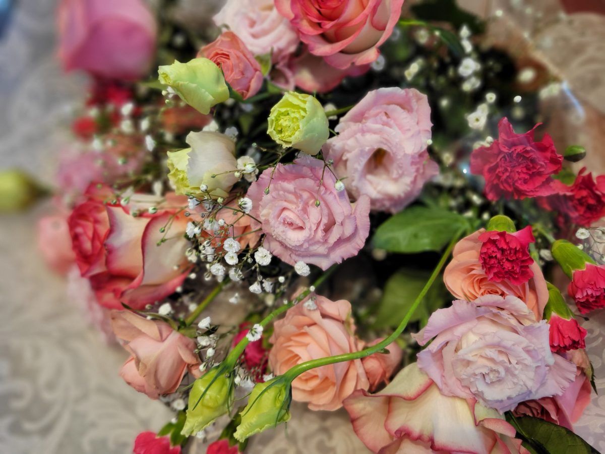 大輪のバラ や ピンクのトルコキキョウを ミックスしてお作りしました