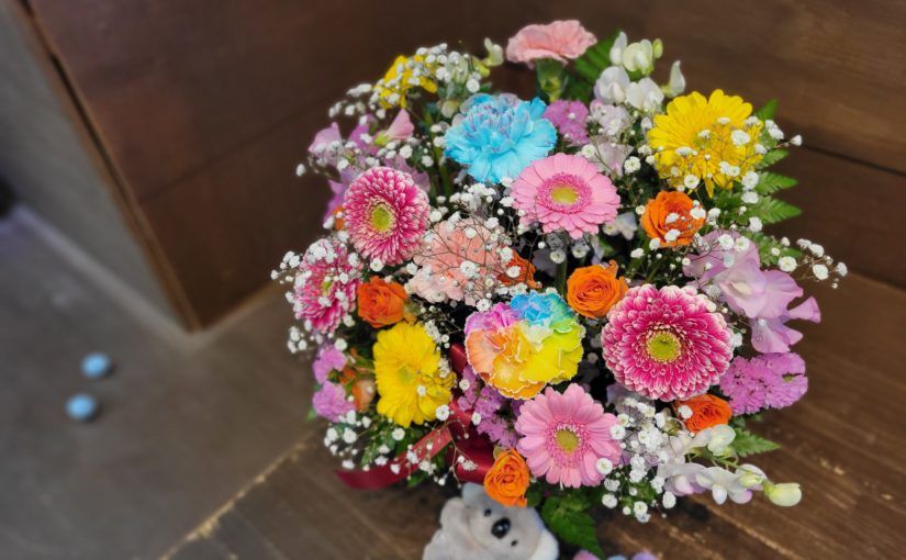 こちらはお誕生日祝いのアレンジ バラやレインボーのカーネーションを使ってお作りしました