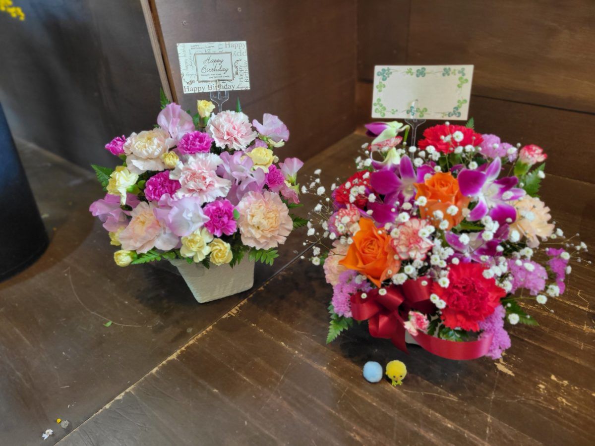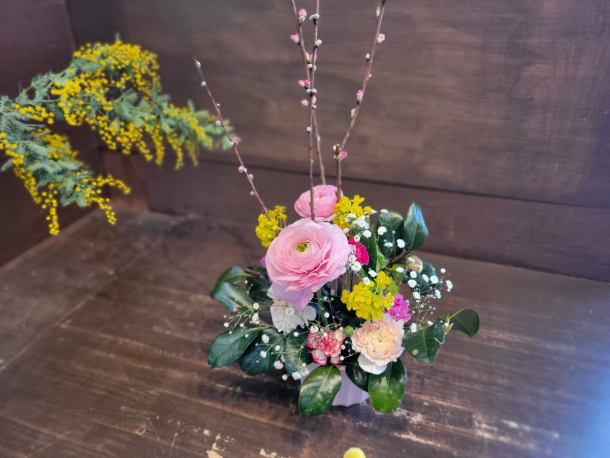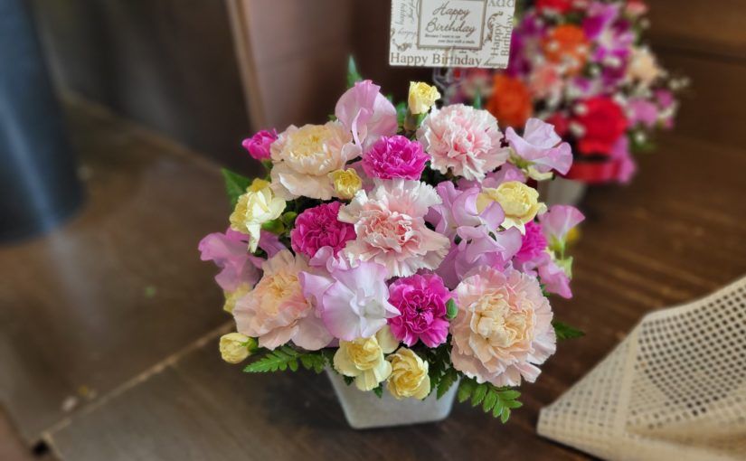 春のお花をふんだんに使った お誕生日祝いのアレンジ