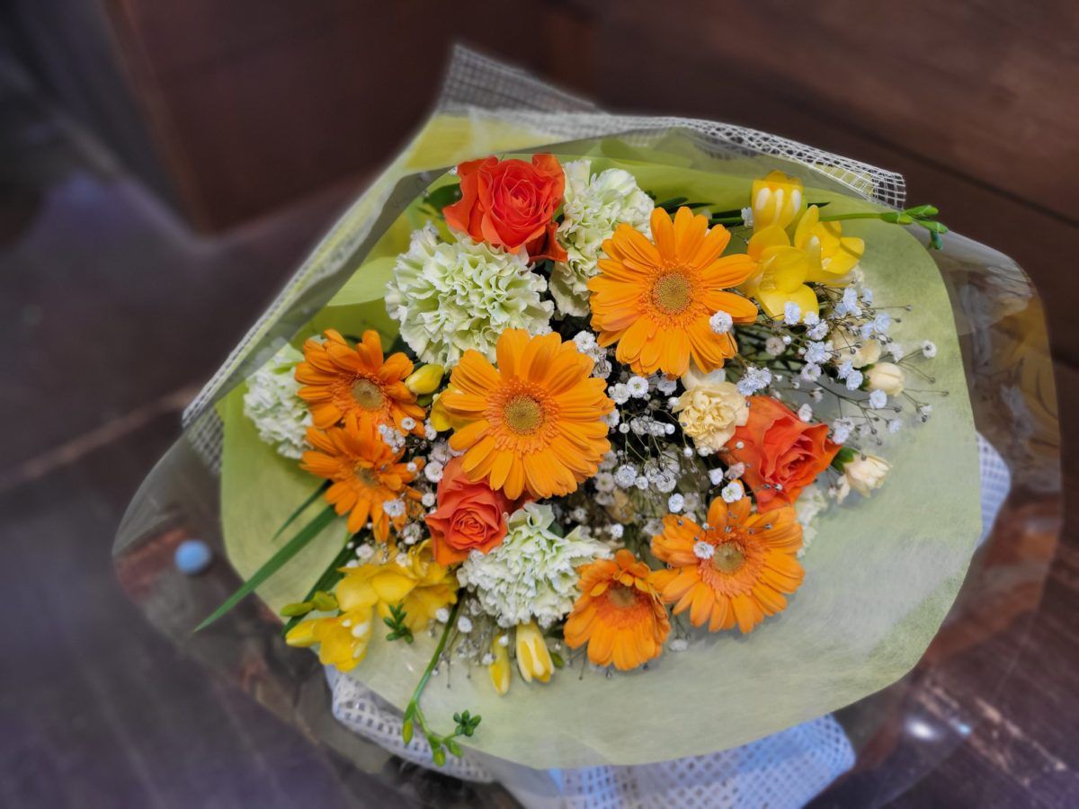 オレンジのガーベラとバラとフリージアで仕上げた 感謝の花束