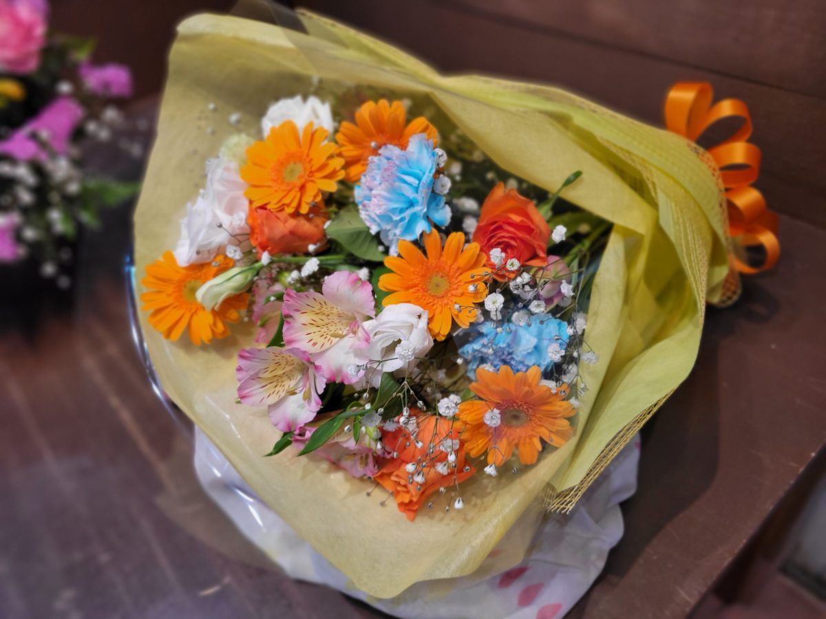オレンジのガーベラにブルーのカーネーションをあしらった感謝の花束