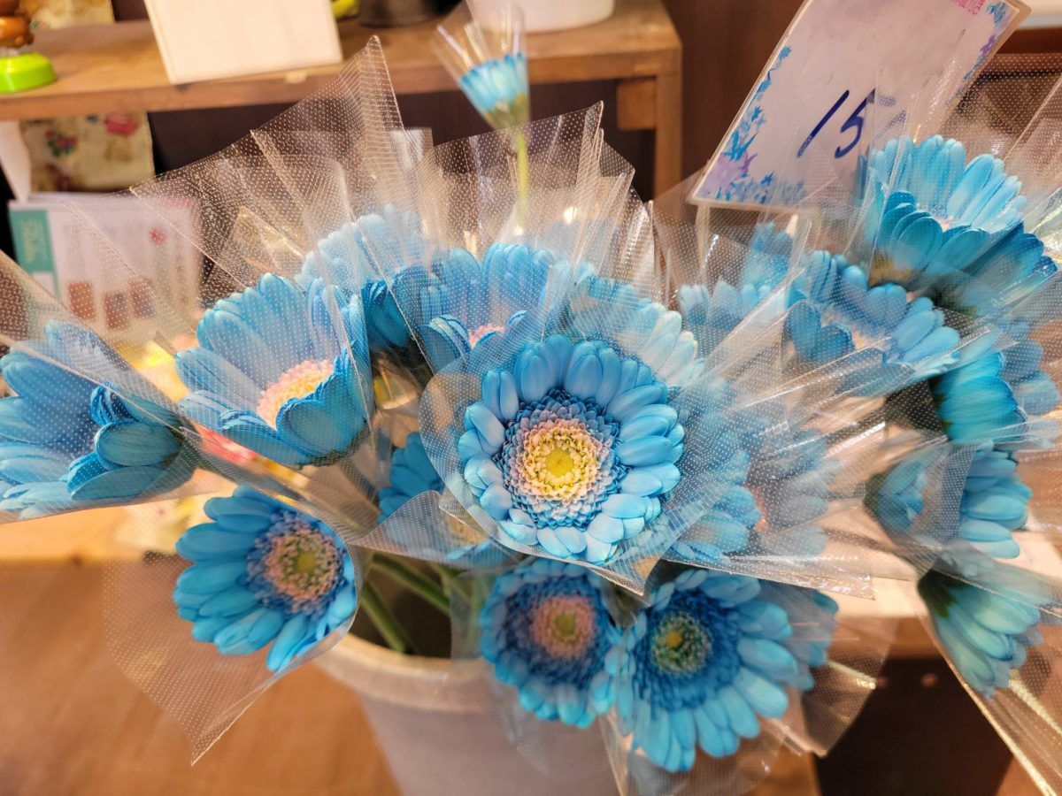 こちらは水色のガーベラ 一本の束でもとても存在感がありますよ