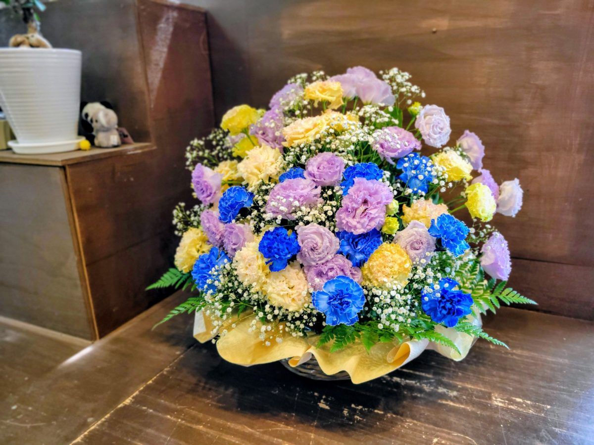 こちらは 紫のトルコキキョウとブルーのカーネーションのお祝いのアレンジ
