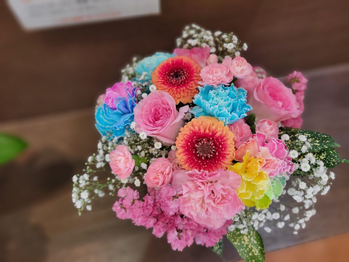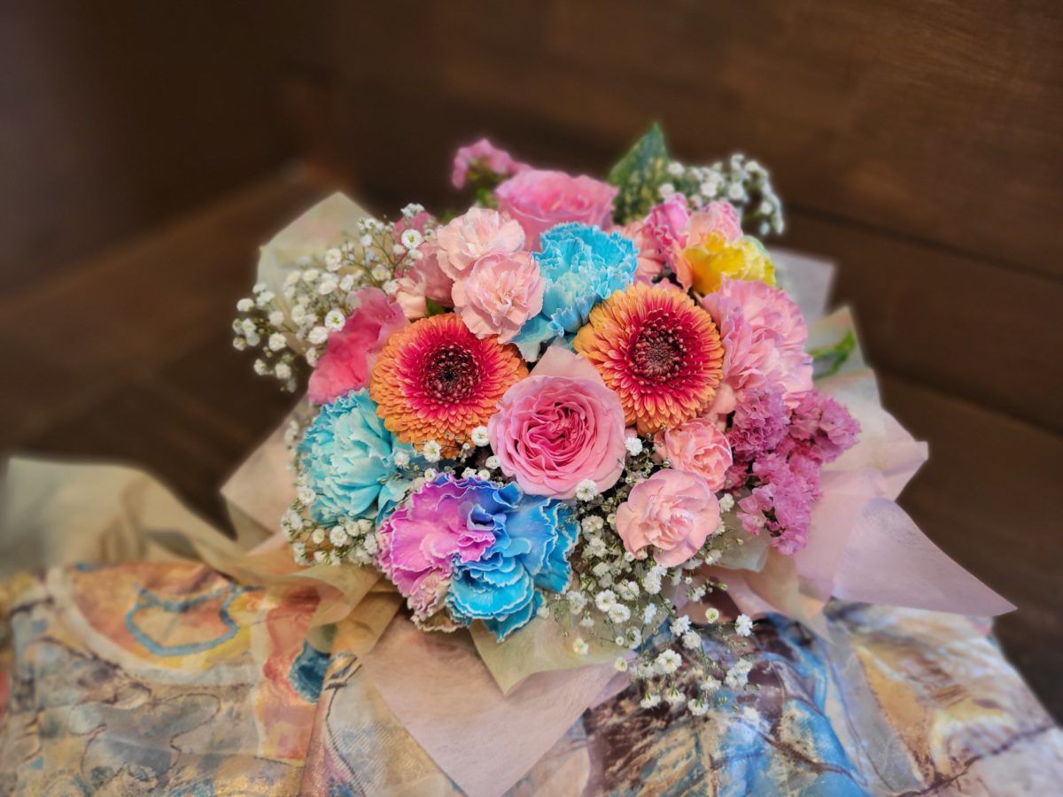女の子の発表会にプレゼントするブーケ です ポンポン ガーベラと水色のカーネーション そして レインボーのカーネーションも入れてカラフルに仕上げました