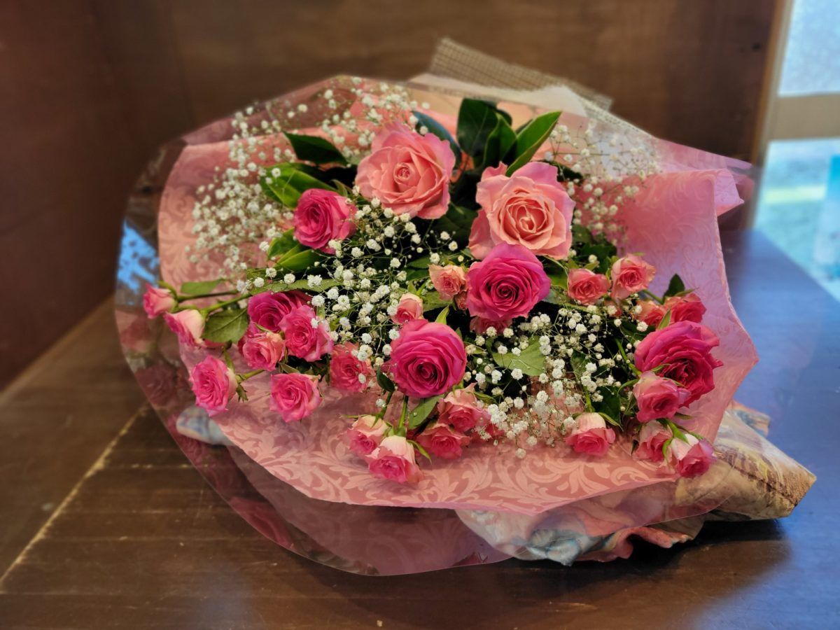 こちらはピンクの薔薇 フェリシタルを中心にお作りした花束