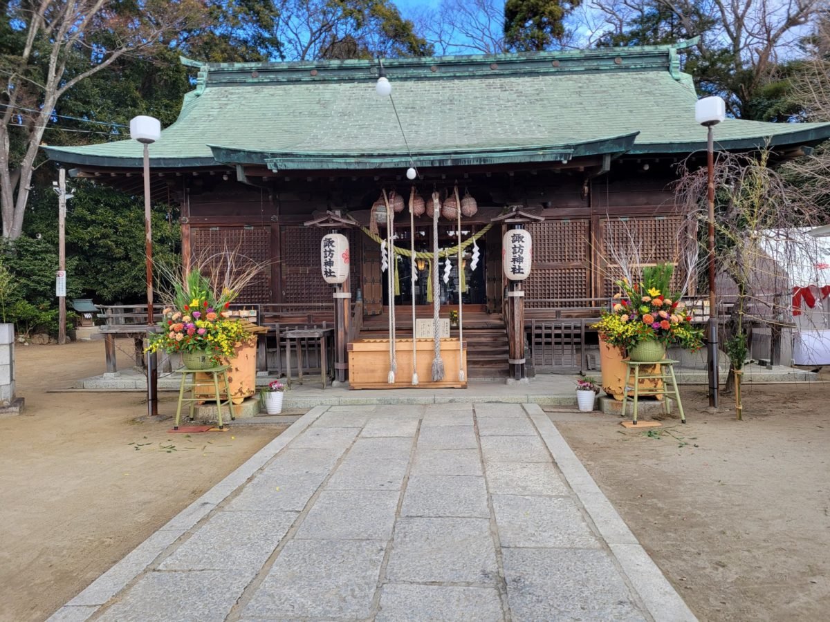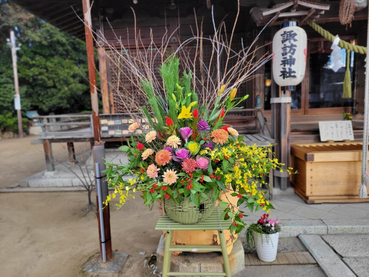 これから小名浜の諏訪神社様へ ご奉納するお花が お店の前に置いてあります