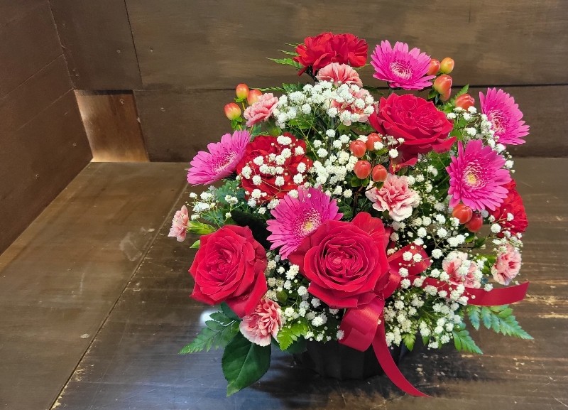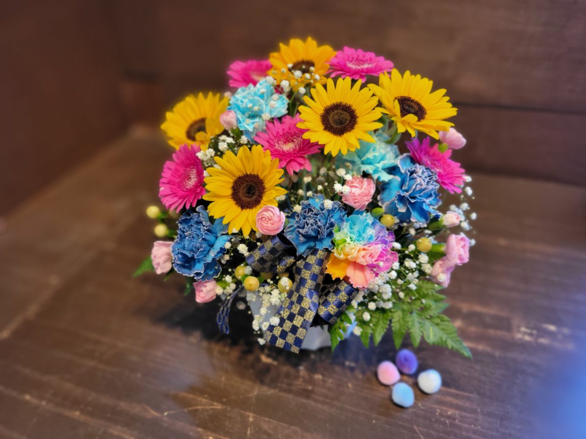 ヒマワリのようにまっすぐな想いと、ガーベラの希望、カーネーションの感謝の気持ちを込めて贈ります。