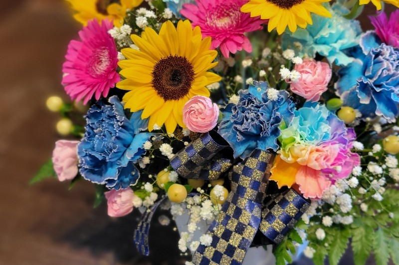 全体として、明るく元気を与える「夏のビタミンカラー」と、爽やかな「ブルー&レインボー」のコントラストで、とても華やかで印象的なアレンジメントです。