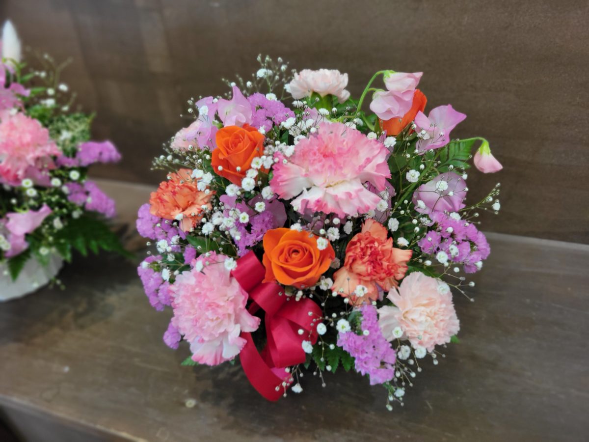 オレンジバラを中心にお作りしたお祝いのアレンジ